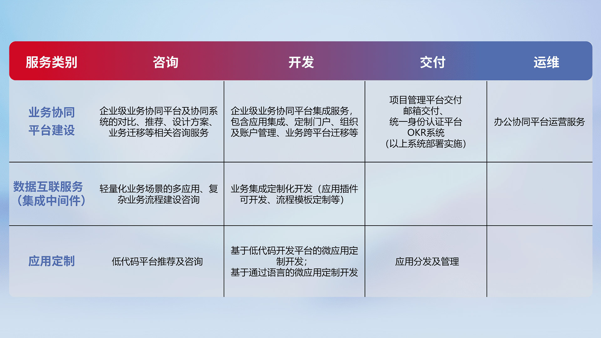 针对钉钉、、、企微、、、、IDaas等平台级产品提供产品的规划、、、方案、、、交付、、、定制化开发等服务,,实现如统一协同办公、、智能客户服务、、、混合会议管理、、智能数据查询、、、等业务场景,,,,实现数字化转型。。