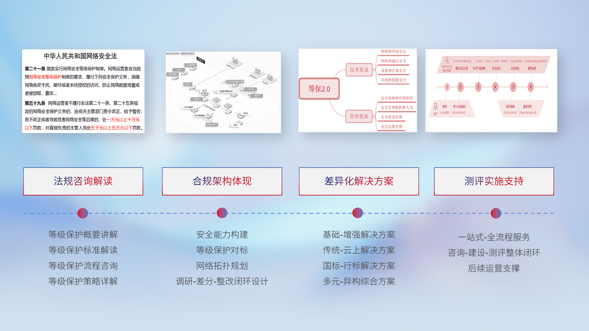 通过专业的法律咨询解读、、合规架构体现、、、、差异化解决方案、、测试实施支持等服务,,,为客户量身打造等保合规体系。。。。